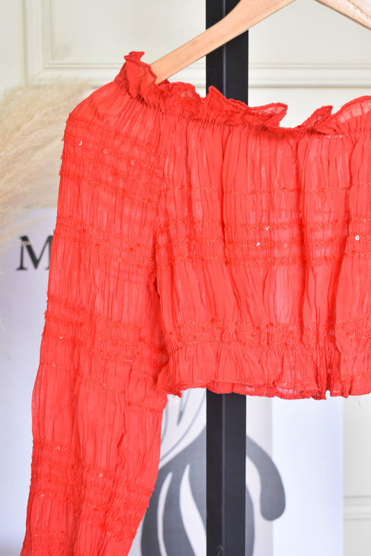 Off Shoulder Cropped Long Sleeve Shirred Top